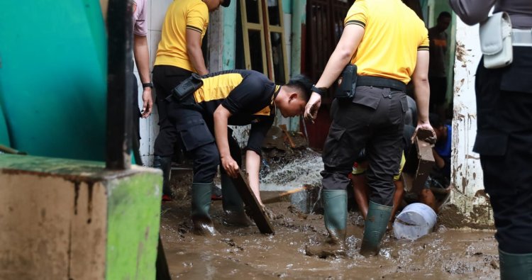 Bersama Sat Brimob, BPBD, relawan, serta instansi terkait, Polres Jember Polda Jatim bahu membahu melaksanakan kerja bakti membersihkan rumah dan lingkungan warga yang terdampak luapan air.